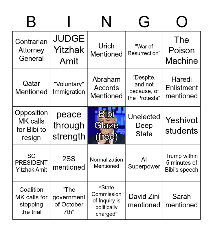 This bingo card has a free space and 28 words: Trump within 5 minutes of Bibi's speech, Collapse of the Shi'ite axis, "Despite, and not because, of the Protests", David Zini mentioned, Qatar Mentioned, Urich Mentioned, JUDGE Yitzhak Amit, SC PRESIDENT Yitzhak Amit, Unelected Deep State, Coalition MK calls for stopping the trial, Opposition MK calls for Bibi to resign, "War of Resurrection", "The government of October 7th", ״State Commission of Inquiry is politically charged", Haredi Enlistment mentioned, Riviera in Gaza, 2SS mentioned, "Voluntary" Immigration, Abraham Accords Mentioned, Normalization Mentioned, Contrarian Attorney General, no Palestinian state, Sarah mentioned, peace through strength, Yeshivot students, AI Superpower, The Poison Machine and Panic Channels.