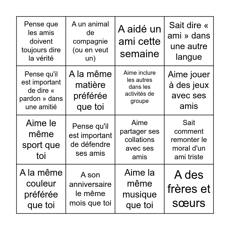 This bingo card has 16 words: A la même couleur préférée que toi, A son anniversaire le même mois que toi, A aidé un ami cette semaine, Sait dire « ami » dans une autre langue, Pense qu'il est important de dire « pardon » dans une amitié, A un animal de compagnie (ou en veut un), Aime partager ses collations avec ses amis, Sait comment remonter le moral d'un ami triste, Pense que les amis doivent toujours dire la vérité, A la même matière préférée que toi, Aime la même musique que toi, Aime jouer à des jeux avec ses amis, Aime le même sport que toi, Pense qu'il est important de défendre ses amis, Aime inclure les autres dans les activités de groupe and A des frères et sœurs.