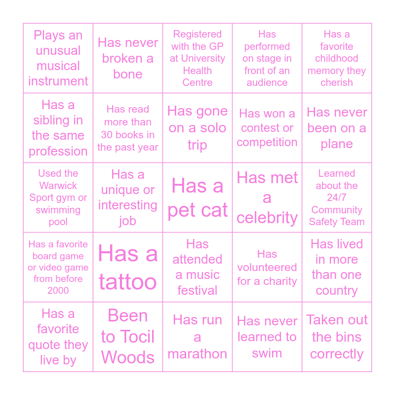 This bingo card has 49 words: Has traveled to more than five countries, Has a pet cat, Has a fear of public speaking, Has run a marathon, Has a tattoo, Has a degree in a STEM field, Has never broken a bone, Speaks more than one language fluently, Has a sibling in the same profession, Has been skydiving, Has read more than 30 books in the past year, Has performed on stage in front of an audience, Has lived in more than one country, Has volunteered for a charity, Has been scuba diving, Has a favorite sports team, Has gone on a solo trip, Has met a celebrity, Has never been to a concert, Has a favorite childhood memory they cherish, Has a unique or interesting job, Has never learned to swim, Plays an unusual musical instrument, Has won a contest or competition, Has gone bungee jumping, Has never been on a plane, Has a favorite quote they live by, Has tried a food they didn't think they'd like, but ended up loving, Has attended a music festival, Has a favorite board game or video game from before 2000, Visited your Residence Hub, Used the Wellbeing Portal, Found The Nook, Won a freebie from a Welcome Fair stall, Been to Tocil Woods, Joined a Warwick Society or Sports Club, Used Warwick MyAdvantage to look for jobs or events, Found your way to the Library and used a study space, Learned about the 24/7 Community Safety Team, Collected post from my letterbox, Collected a parcel from my collection point, Learned how to report a maintenance issue on the Invida Resolve app, Taken out the bins correctly, Attended an RCT event, Used the Warwick Sport gym or swimming pool, Registered with the GP at University Health Centre, Found Warwick Chaplaincy or attended a mindfulness session, Borrowed equipment from the IT Services Helpdesk or Library and Followed @rct_warwickuni.