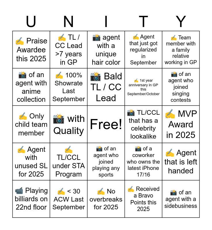 This bingo card has a free space and 50 words: ✍ 100% ASAT Last September, ✍ < 30 ACW Last September, ✍ Commendation in 2025, ✍ No late in Q3, ✍ MVP Award in 2025, ✍ Agent >5 years in GP, ✍ TL / CC Lead >7 years in GP, ✍ Running 3.8+ YTD Scorecard 2025, ✍ 1st year anniversary in GP this September/October, ✍ Exceeds Expectations in September, ✍ Praise Awardee this 2025, ✍ 100% Showrate Last September, ✍ No overbreaks for 2025, ✍ Received a Bravo Points this 2025, 📸 with Faciltiies / Security / Concessionaire, 📸 with Trainer, 📸 with Quality, 📸 Bald TL / CC Lead, 📸 of an agent with multiple tattooes, ✍ Team member with a family relative working in GP, ✍ Only child team member, 📸 of an agent cooking, 📸 agent with a unique hair color, 📸 TL/CCL that has a celebrity lookalike, 📸 Agent that is > 55 years old, ✍ Agent with unused SL for 2025, ✍ TL/CCL under STA Program, ✍ Agent currently on nesting, ✍ Agent that just got regularized in September, ✍ Agent that is left handed, ✍ Agent that is a working student, ✍ Agent that has a birthday in October, ✍ Agent that has a 10 letter first name, 📹 Video of an agent speaking in a different language, 📹 Video of an agent playing a musical instruments, 📹 Playing billiards on 22nd floor, 📸 of a plantito / plantita, 📸 Pinaka gwapong TL, 📸 Pinaka magandang TL, 📸 of an agent who joined singing contests, 📸 of an agent who joined beauty pageants, 📸 of an agent who joined a marathon, 📸 of an agent who joined playing any sports, 📸 of an agent that is a cat lover, 📸 of an agent with a sidebusiness, 📸 of an agent with anime collection, 📸 of an agent with marvel collection, 📸 of an agent with kpop collection, 📸 of a coworker who owns the latest iPhone 17/16 and 📸 of a coworker who owns the latest Samsung S25/S24.