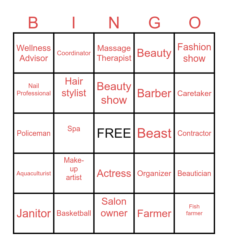 This bingo card has a free space and 24 words: Make-up artist, Basketball, Beauty show, Janitor, Fashion show, Wellness Advisor, Nail Professional, Coordinator, Beast, Actress, Barber, Policeman, Organizer, Beautician, Hair stylist, Farmer, Contractor, Massage Therapist, Caretaker, Spa, Fish farmer, Aquaculturist, Beauty and Salon owner.
