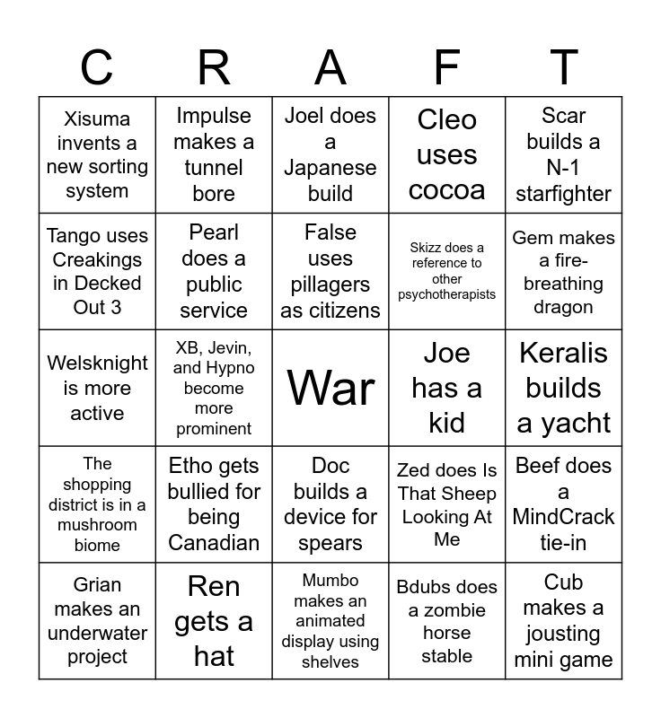 This bingo card has a free space and 24 words: Etho gets bullied for being Canadian, Ren gets a hat, False uses pillagers as citizens, Grian makes an underwater project, Scar builds a N-1 starfighter, Xisuma invents a new sorting system, Tango uses Creakings in Decked Out 3, Impulse makes a tunnel bore, Joe has a kid, Doc builds a device for spears, Skizz does a reference to other psychotherapists, Welsknight is more active, Zed does Is That Sheep Looking At Me, Beef does a MindCrack tie-in, Pearl does a public service, Bdubs does a zombie horse stable, Keralis builds a yacht, Joel does a Japanese build, Gem makes a fire-breathing dragon, XB, Jevin, and Hypno become more prominent, Cub makes a jousting mini game, The shopping district is in a mushroom biome, Cleo uses cocoa and Mumbo makes an animated display using shelves.