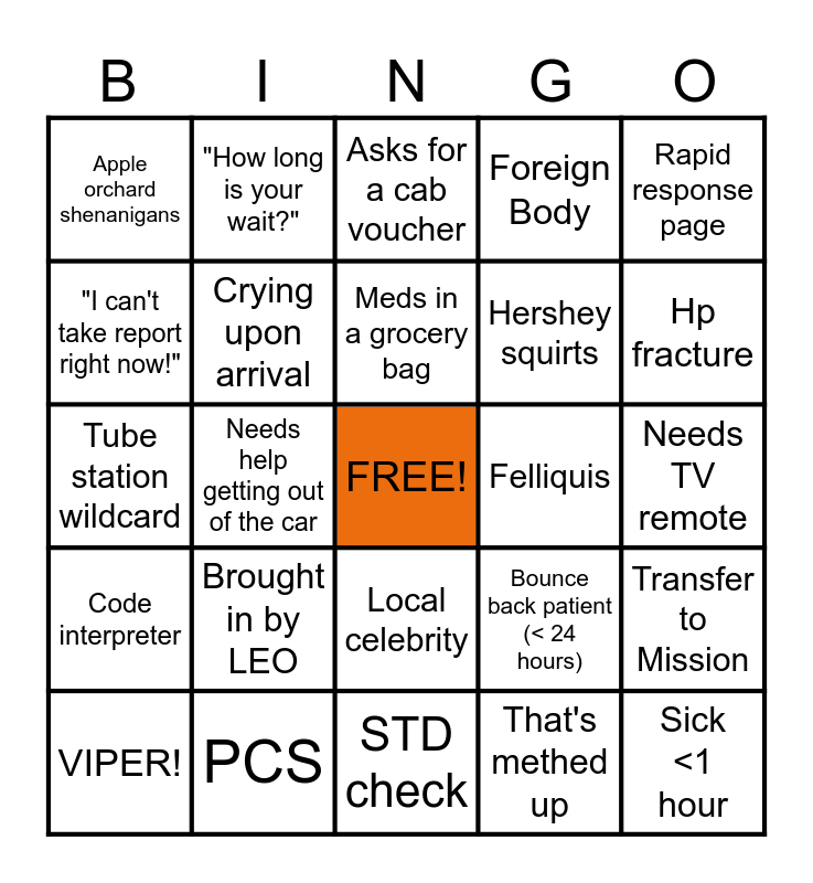This bingo card has a free space and 24 words: Brought in by LEO, PCS, Meds in a grocery bag, VIPER!, Rapid response page, Apple orchard shenanigans, "I can't take report right now!", "How long is your wait?", Felliquis, Local celebrity, Hershey squirts, Tube station wildcard, Bounce back patient (< 24 hours), Transfer to Mission, Crying upon arrival, That's methed up, Needs TV remote, Asks for a cab voucher, Hp fracture, Needs help getting out of the car, Sick <1 hour, Code interpreter, Foreign Body and STD check.