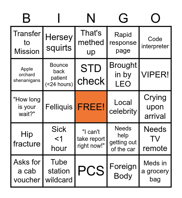 This bingo card has a free space and 24 words: Sick <1 hour, Tube station wildcard, STD check, Asks for a cab voucher, Code interpreter, Transfer to Mission, Apple orchard shenanigans, Hersey squirts, Local celebrity, "I can't take report right now!", Brought in by LEO, "How long is your wait?", Needs help getting out of the car, Needs TV remote, Bounce back patient (<24 hours), Foreign Body, Crying upon arrival, That's methed up, VIPER!, Felliquis, Meds in a grocery bag, Hip fracture, Rapid response page and PCS.