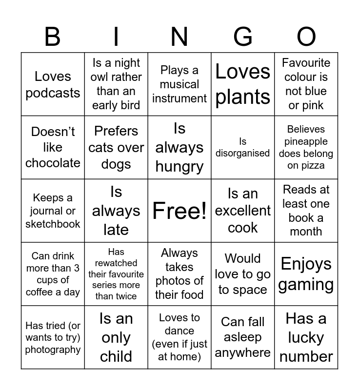 This bingo card has a free space and 31 words: Loves to dance (even if just at home), Has lived in more than three countries, Is always late, Has a name that means something special in another language, Loves podcasts, Plays a musical instrument, Prefers cats over dogs, Would love to go to space, Is an excellent cook, Can fall asleep anywhere, Reads at least one book a month, Has a lucky number, Likes hiking, Speaks three or more languages, Believes pineapple does belong on pizza, Likes to draw, Enjoys gaming, Has rewatched their favourite series more than twice, Can drink more than 3 cups of coffee a day, Always takes photos of their food, Favourite colour is not blue or pink, Grew up bilingual or in a multilingual household, Has tried (or wants to try) photography, Is a night owl rather than an early bird, Is disorganised, Doesn’t like chocolate, Loves plants, Keeps a journal or sketchbook, Is an only child, Is always hungry and Loves board games or puzzles.