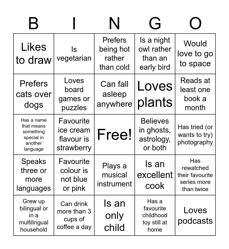 This bingo card has a free space and 32 words: Has a favourite childhood toy still at home, Enjoys gaming, Favourite ice cream flavour is strawberry, Is always hungry, Speaks three or more languages, Loves board games or puzzles, Would love to go to space, Has rewatched their favourite series more than twice, Is vegetarian, Has a lucky number, Can fall asleep anywhere, Prefers being hot rather than cold, Is disorganised, Likes hiking, Believes in ghosts, astrology, or both, Loves to dance (even if just at home), Grew up bilingual or in a multilingual household, Has a name that means something special in another language, Plays a musical instrument, Favourite colour is not blue or pink, Is an excellent cook, Is always late, Has tried (or wants to try) photography, Can drink more than 3 cups of coffee a day, Loves podcasts, Is a night owl rather than an early bird, Loves plants, Prefers cats over dogs, Likes to draw, Is an only child, Doesn’t like chocolate and Reads at least one book a month.
