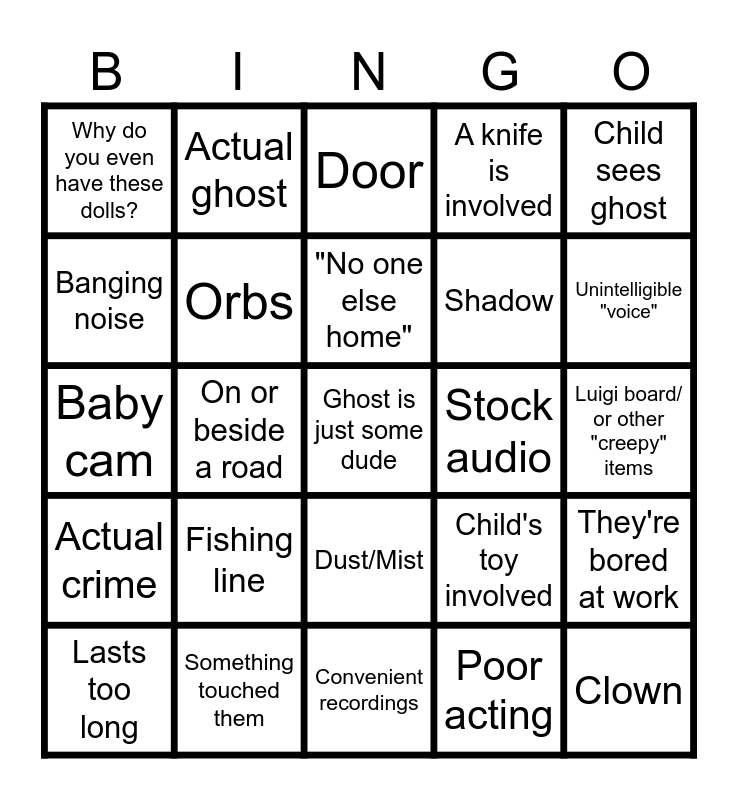 This bingo card has 35 words: "Or is it just an elaborate hoax", Aliens, Potato quality footage, Orbs, Dust/Mist, A knife is involved, Banging noise, Doesn't check corners, "No one else home", Its in the window, Baby cam, Child sees ghost, Free!, Pet(s) freak out, Why do you even have these dolls?, Stock audio, Poor acting, On or beside a road, Actual crime, Ghost is just some dude, Child's toy involved, Lasts too long, They're bored at work, Something touched them, Door, Unintelligible "voice", Clown, Throwing stuff, Shadow, Luigi board/ or other "creepy" items, Seance, Convenient recordings, Fishing line, Actual ghost and Weird editing.