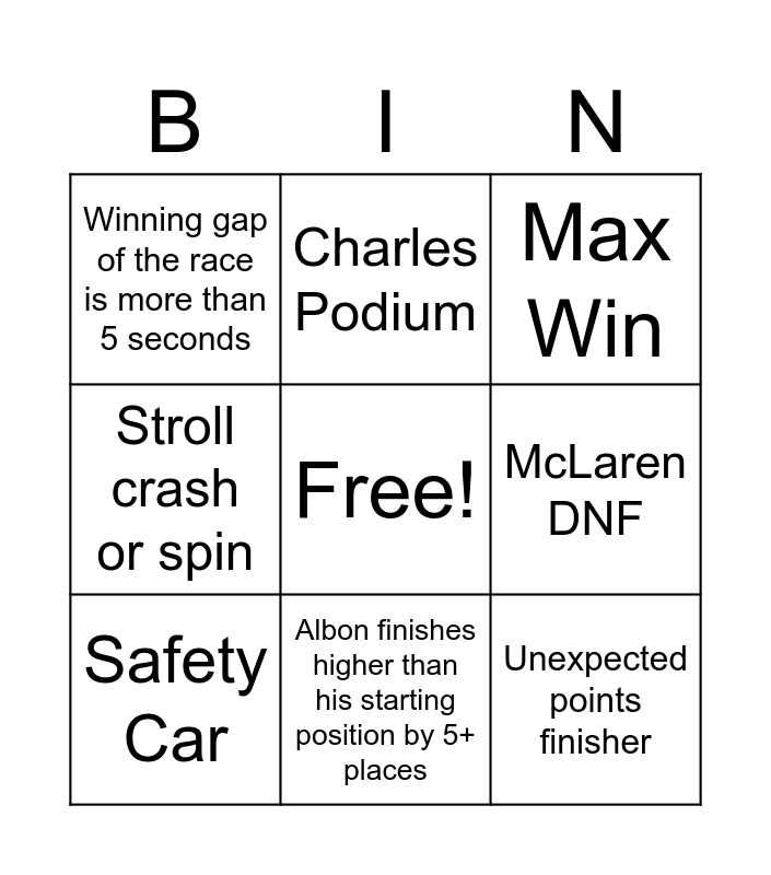 This bingo card has a free space and 8 words: McLaren DNF, Max Win, Charles Podium, Safety Car, Winning gap of the race is more than 5 seconds, Unexpected points finisher, Stroll crash or spin and Albon finishes higher than his starting position by 5+ places.