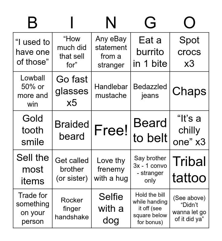 This bingo card has a free space and 24 words: Get called brother (or sister), Rocker finger handshake, Handlebar mustache, Trade for something on your person, Spot crocs x3, “I used to have one of those”, Lowball 50% or more and win, “How much did that sell for”, Beard to belt, Love thy frenemy with a hug, Bedazzled jeans, Gold tooth smile, Say brother 3x - 1 convo - stranger only, Tribal tattoo, Go fast glasses x5, Hold the bill while handing it off (see square below for bonus), “It’s a chilly one” x3, Any eBay statement from a stranger, Chaps, Braided beard, (See above) “Didn’t wanna let go of it did ya”, Sell the most items, Eat a burrito in 1 bite and Selfie with a dog.