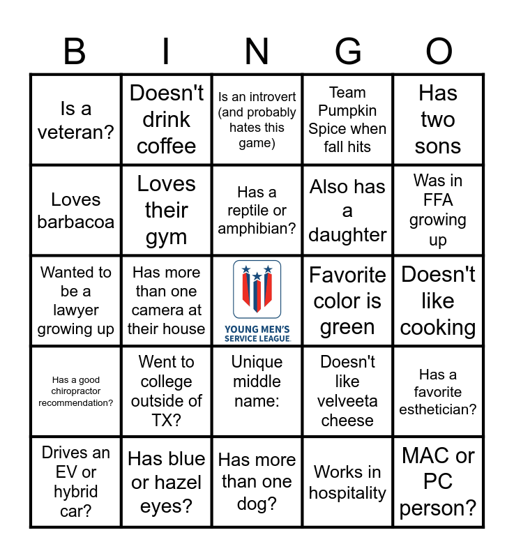 This bingo card has a free space and 24 words: Went to college outside of TX?, Has blue or hazel eyes?, Has a reptile or amphibian?, Drives an EV or hybrid car?, Has two sons, Is a veteran?, Loves barbacoa, Doesn't drink coffee, Favorite color is green, Unique middle name:, Also has a daughter, Wanted to be a lawyer growing up, Doesn't like velveeta cheese, Has a favorite esthetician?, Loves their gym, Works in hospitality, Doesn't like cooking, Is an introvert (and probably hates this game), Was in FFA growing up, Has more than one camera at their house, MAC or PC person?, Has a good chiropractor recommendation?, Team Pumpkin Spice when fall hits and Has more than one dog?.
