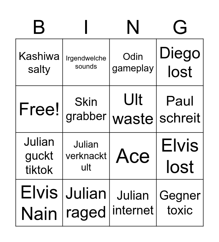 This bingo card has 16 words: Julian raged, Elvis lost, Odin gameplay, Kashiwa salty, Julian guckt tiktok, Irgendwelche sounds, Ace, Julian internet, Free!, Skin grabber, Elvis Nain, Diego lost, Julian verknackt ult, Paul schreit, Ult waste and Gegner toxic.