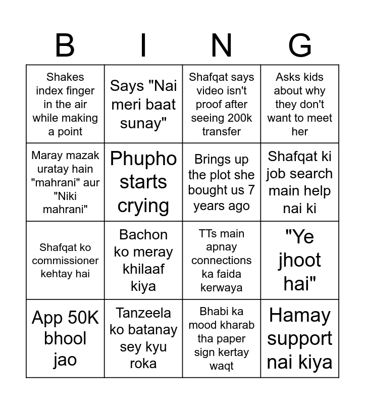 This bingo card has 17 words: App 50K bhool jao, Tanzeela ko batanay sey kyu roka, Shafqat says video isn't proof after seeing 200k transfer, Asks kids about why they don't want to meet her, Shafqat ko commissioner kehtay hai, Phupho starts crying, TTs main apnay connections ka faida kerwaya, Shafqat ki job search main help nai ki, Maray mazak uratay hain "mahrani" aur "Niki mahrani", Bachon ko meray khilaaf kiya, Bhabi ka mood kharab tha paper sign kertay waqt, "Ye jhoot hai", Shakes index finger in the air while making a point, Says "Nai meri baat sunay", Brings up the plot she bought us 7 years ago, Hamay support nai kiya and Hamay support nai kiya.