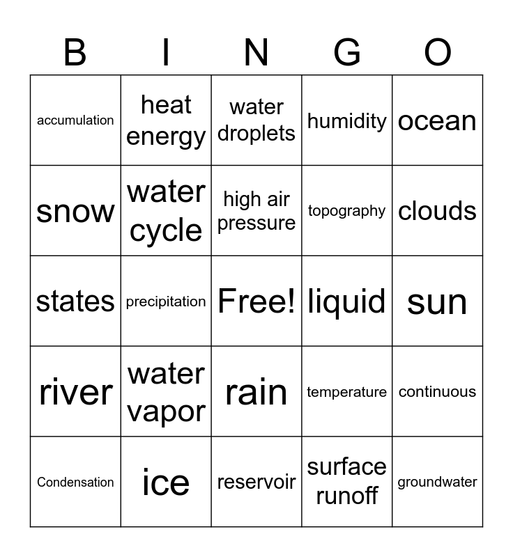 This bingo card has a free space and 29 words: Condensation, transpiration, precipitation, evaporation, accumulation, water droplets, water cycle, water vapor, liquid, ice, sun, groundwater, reservoir, surface runoff, clouds, gas, rain, river, ocean, states, temperature, air pressure, topography, snow, humidity, heat energy, continuous, high air pressure and low air pressure.