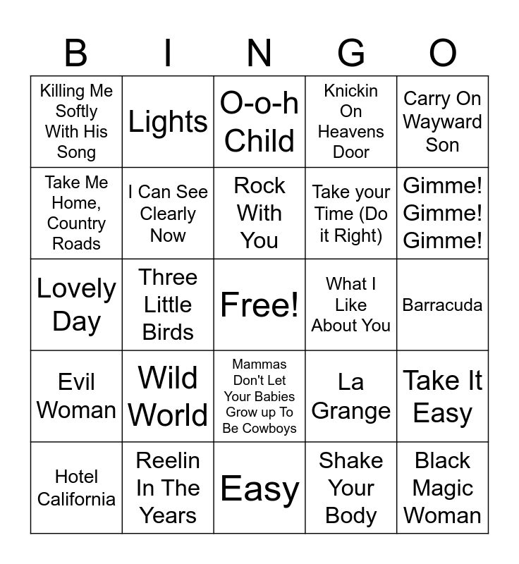 This bingo card has a free space and 81 words: September, Come & Get Your Love, O-o-h Child, Ain't No Sunshine, Piano Man, Rich Girl, Play That Funky Music, More Than A Feeling, Brandy (Your A Fine Girl), Blame it on The Boogie, Born To Run, Don't Stop Till You Get Enough, Knickin On Heavens Door, Killing Me Softly With His Song, Best Of My Love, Take Me Home, Country Roads, I Was Made For Loving You, Wild World, Sweet Home Alabama, Barracuda, Roxanne, Carry On Wayward Son, Lovely Day, Rock With You, I Can See Clearly Now, Copacabana, (Don't Fear) The Reaper, It's Too Late, Jolene, Staying Alive, Gimme! Gimme! Gimme!, Me And Bobby McGee, Easy, The Chain, Hotel California, What I Like About You, Midnight Train To Georgia, The Devil Went Down To Georgia, Lady Marmalade, Your Song, Black Magic Woman, Love Train, Walk On The Wild Side, Sweet Emotion, Three Little Birds, Lowdown, Lights, Got To Be Real, Black Betty, How Deep Is Your Love, La Grange, Take It Easy, Summer Nights, Go Your Own Way, Dancing Queen, You've Got A Friend, Two Tickets To Paradise, Wonderful Tonight, Use Me, Mississippi Queen, Mammas Don't Let Your Babies Grow up To Be Cowboys, If You Don't Know Me By Now, Ain't No Stoppin Us Now, T.N.T., Paradise By The Dashboard Light, Dust In The Wind, Don't Bring Me Down, Boogie Wonderland, Cecilia, Only The Good Die Young, Kodachrome, Evil Woman, Reelin In The Years, Sultans Of Swing, In The Summertime, Born To Be Alive, Let's Groove, Shake Your Body, Macho Man, Take your Time (Do it Right) and I Love The Nightlife.