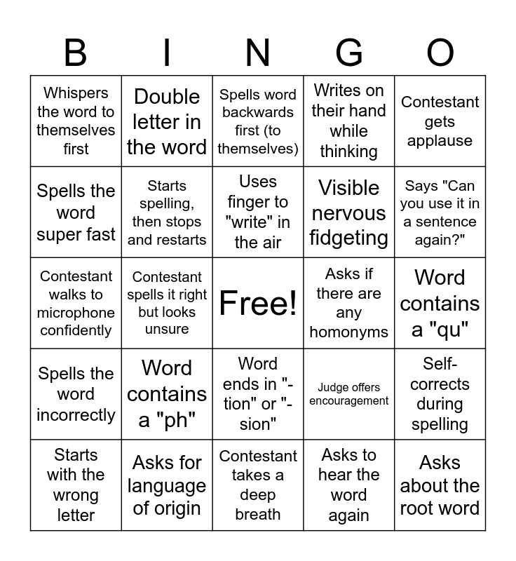 This bingo card has a free space and 60 words: Asks for the definition, Asks for language of origin, Asks for the word in a sentence, Spells the word incorrectly, Asks to hear the word again, Spells it correctly on first try, Starts spelling, then stops and restarts, Asks if there are alternate pronunciations, Visible nervous fidgeting, Asks for part of speech, Writes on their hand while thinking, Closes their eyes while spelling, Spells the word super fast, Spells the word very slowly, Asks for the word to be repeated twice, Whispers the word to themselves first, Asks about the root word, Contestant gets applause, Pauses for more than 5 seconds, Uses finger to "write" in the air, Asks if there are any homonyms, Spells word backwards first (to themselves), Starts with the wrong letter, Self-corrects during spelling, Judge says "That is correct!", Judge rings the bell for incorrect spelling, Contestant looks relieved after spelling, Asks about accent marks or diacriticals, Says "Can you use it in a sentence again?", Multiple people miss the same word, Word is from Greek origin, Word is from Latin origin, Word is from French origin, Silent letter in the word, Double letter in the word, Word has more than 10 letters, Word has fewer than 5 letters, Contestant spells it right but looks unsure, Audience gasps at a difficult word, Contestant walks to microphone confidently, Asks for clarification on pronunciation, Word contains a "ph", Word contains a "qu", Contestant laughs nervously, Judge offers encouragement, Word is a compound word, Contestant mouths the word silently first, Time warning given, Asks about capitalization, Word ends in "-tion" or "-sion", Contestant takes a deep breath, Says "I know this one!", Says "I've never heard of that word", Contestant adjusts microphone, Parent/supporter looks nervous in audience, Word has three or more syllables, Contestant asks judge to speak louder, Quick elimination (wrong on first letter or two), Contestant receives standing ovation and Word contains a "z”.
