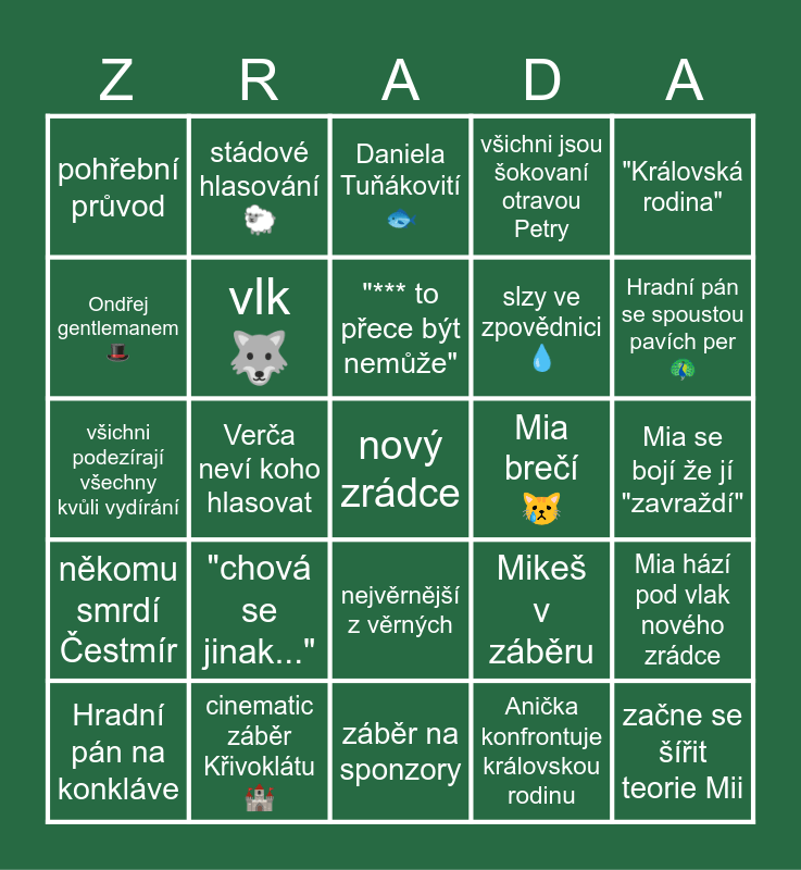 This bingo card has a free space and 24 words: "chová se jinak...", cinematic záběr Křivoklátu 🏰, "*** to přece být nemůže", Hradní pán na konkláve, "Královská rodina", pohřební průvod, Ondřej gentlemanem 🎩, stádové hlasování 🐑, Mia brečí 😿, nejvěrnější z věrných, slzy ve zpovědnici 💧, všichni podezírají všechny kvůli vydírání, Mikeš v záběru, Mia hází pod vlak nového zrádce, vlk 🐺, Anička konfrontuje královskou rodinu, Mia se bojí že jí "zavraždí", Daniela Tuňákovití 🐟, Hradní pán se spoustou pavích per🦚, Verča neví koho hlasovat, začne se šířit teorie Mii, někomu smrdí Čestmír, všichni jsou šokovaní otravou Petry and záběr na sponzory.