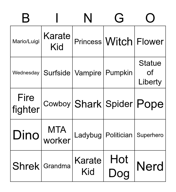 This bingo card has 25 words: Dino, Grandma, Shark, Hot Dog, Flower, Mario/Luigi, Karate Kid, Princess, Spider, Superhero, Wednesday, Surfside, Karate Kid, Politician, Statue of Liberty, Shrek, Cowboy, Vampire, Pumpkin, Pope, Fire fighter, MTA worker, Ladybug, Witch and Nerd.