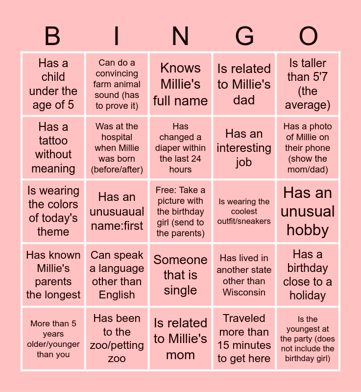 This bingo card has a free space and 24 words: Can speak a language other than English, Has been to the zoo/petting zoo, Has changed a diaper within the last 24 hours, More than 5 years older/younger than you, Is taller than 5'7 (the average), Has a child under the age of 5, Has a tattoo without meaning, Can do a convincing farm animal sound (has to prove it), Is wearing the coolest outfit/sneakers, Someone that is single, Has an interesting job, Is wearing the colors of today's theme, Has lived in another state other than Wisconsin, Has a birthday close to a holiday, Was at the hospital when Millie was born (before/after), Traveled more than 15 minutes to get here, Has an unusual hobby, Knows Millie's full name, Has a photo of Millie on their phone (show the mom/dad), Has an unusuaual name:first, Is the youngest at the party (does not include the birthday girl), Has known Millie's parents the longest, Is related to Millie's dad and Is related to Millie's mom.