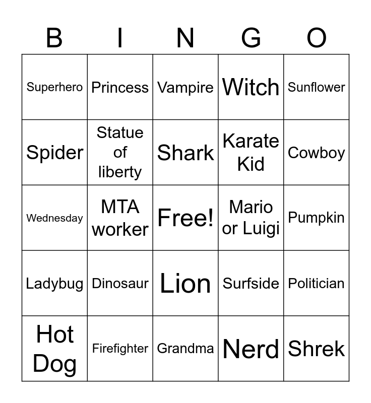 This bingo card has a free space and 25 words: Dinosaur, Grandma, Shark, Hot Dog, Sunflower, Superhero, Spider, Princess, Mario or Luigi, Lion, Karate Kid, Wednesday, Surfside, Politician, Statue of liberty, Pope, Pumpkin, Vampire, Cowboy, MTA worker, Shrek, Firefighter, Ladybug, Witch and Nerd.