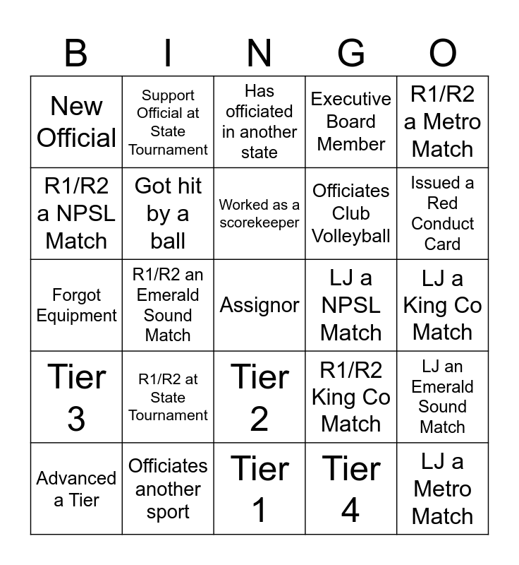 This bingo card has a free space and 24 words: R1/R2 at State Tournament, Officiates another sport, Worked as a scorekeeper, Advanced a Tier, R1/R2 a Metro Match, New Official, R1/R2 a NPSL Match, Support Official at State Tournament, LJ a NPSL Match, Tier 2, Officiates Club Volleyball, Forgot Equipment, R1/R2 King Co Match, LJ an Emerald Sound Match, Got hit by a ball, Tier 4, LJ a King Co Match, Has officiated in another state, Issued a Red Conduct Card, R1/R2 an Emerald Sound Match, LJ a Metro Match, Tier 3, Executive Board Member and Tier 1.