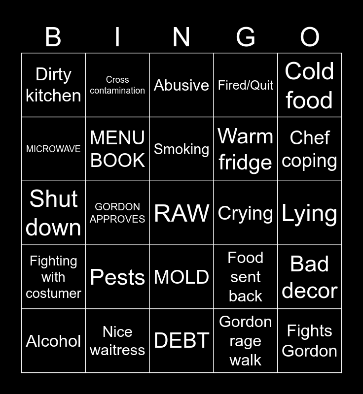This bingo card has a free space and 24 words: Pests, Nice waitress, Smoking, Alcohol, Cold food, Dirty kitchen, MICROWAVE, Cross contamination, Crying, MOLD, Warm fridge, Shut down, Food sent back, Bad decor, MENU BOOK, Gordon rage walk, Lying, Abusive, Chef coping, GORDON APPROVES, Fights Gordon, Fighting with costumer, Fired/Quit and DEBT.