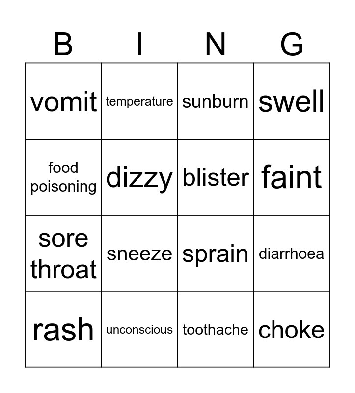 This bingo card has 17 words: toothache, rash, sunburn, vomit, sneeze, swell, diarrhoea, blister, faint, dizzy, unconscious, sprain, food poisoning, temperature, sore throat, allergic reaction and choke.
