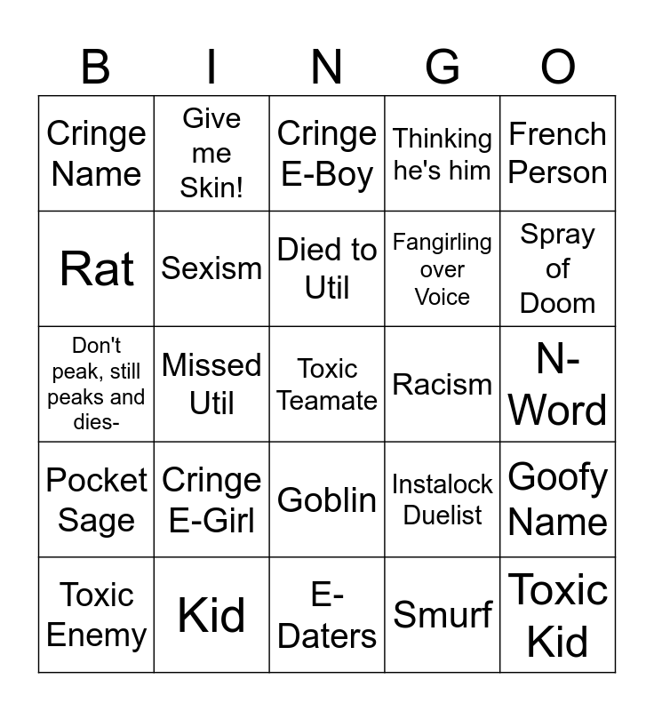 This bingo card has a free space and 24 words: Cringe E-Girl, Kid, Died to Util, Toxic Enemy, French Person, Cringe Name, Rat, Give me Skin!, Racism, Goblin, Fangirling over Voice, Don't peak, still peaks and dies-, Instalock Duelist, Goofy Name, Sexism, Smurf, N-Word, Cringe E-Boy, Spray of Doom, Missed Util, Toxic Kid, Pocket Sage, Thinking he's him and E-Daters.