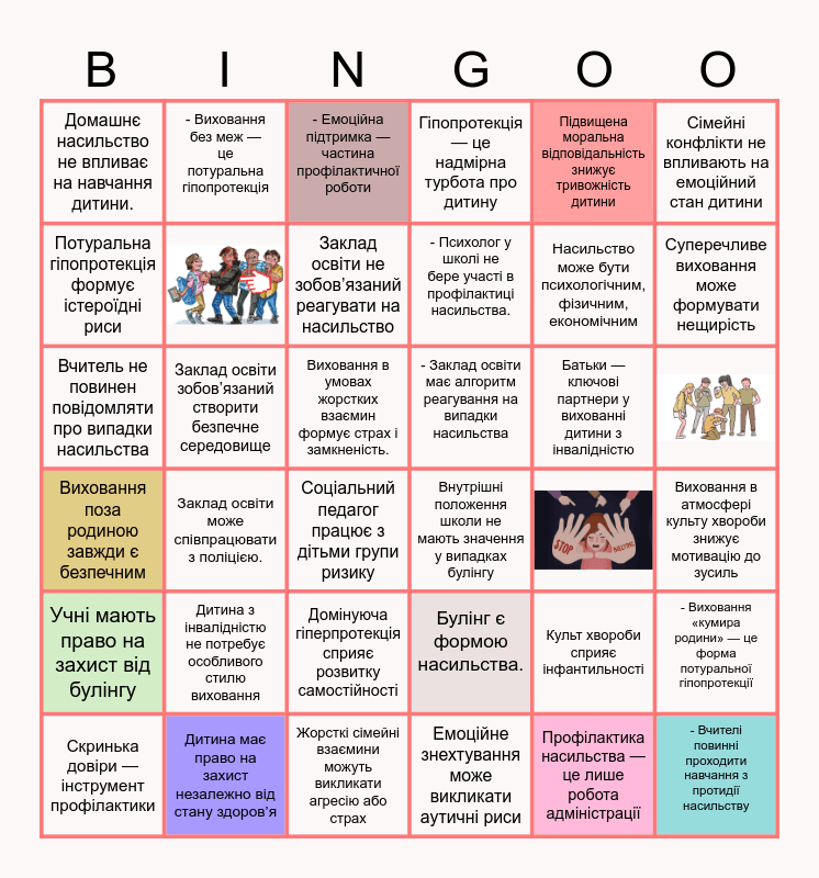 This bingo card has 3 images and 33 words: Булінг є формою насильства., Домінуюча гіперпротекція сприяє розвитку самостійності, Емоційне знехтування може викликати аутичні риси, Потуральна гіпопротекція формує істероїдні риси, Виховання поза родиною завжди є безпечним, - Заклад освіти має алгоритм реагування на випадки насильства, Жорсткі сімейні взаємини можуть викликати агресію або страх, Підвищена моральна відповідальність знижує тривожність дитини, Культ хвороби сприяє інфантильності, Суперечливе виховання може формувати нещирість, Гіпопротекція — це надмірна турбота про дитину, - Виховання «кумира родини» — це форма потуральної гіпопротекції, Заклад освіти зобов’язаний створити безпечне середовище, - Психолог у школі не бере участі в профілактиці насильства., Домашнє насильство не впливає на навчання дитини., Учні мають право на захист від булінгу, Батьки — ключові партнери у вихованні дитини з інвалідністю, Вчитель не повинен повідомляти про випадки насильства, - Емоційна підтримка — частина профілактичної роботи, Виховання в умовах жорстких взаємин формує страх і замкненість., Заклад освіти може співпрацювати з поліцією., Внутрішні положення школи не мають значення у випадках булінгу, Соціальний педагог працює з дітьми групи ризику, - Виховання без меж — це потуральна гіпопротекція, Насильство може бути психологічним, фізичним, економічним, Дитина має право на захист незалежно від стану здоров’я, Заклад освіти не зобов’язаний реагувати на насильство, Сімейні конфлікти не впливають на емоційний стан дитини, - Вчителі повинні проходити навчання з протидії насильству, Скринька довіри — інструмент профілактики, Виховання в атмосфері культу хвороби знижує мотивацію до зусиль, Дитина з інвалідністю не потребує особливого стилю виховання and Профілактика насильства — це лише робота адміністрації.
