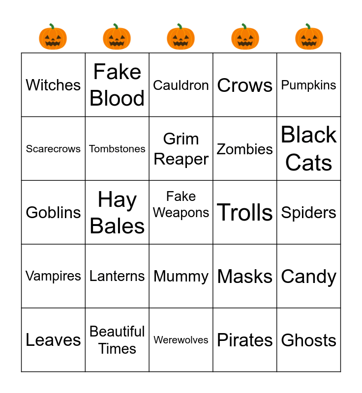 This bingo card has a free space and 24 words: Lanterns, Beautiful Times, Grim Reaper, Leaves, Pumpkins, Witches, Scarecrows, Fake Blood, Trolls, Mummy, Zombies, Goblins, Masks, Candy, Tombstones, Pirates, Spiders, Cauldron, Black Cats, Hay Bales, Ghosts, Vampires, Crows and Werewolves.