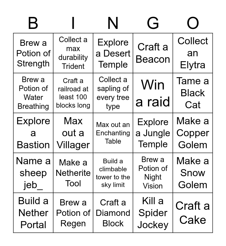 This bingo card has 55 words: Make an Iron Golem, Build a Nether Portal, Collect all types of Wool, Brew a Potion of Strength, Craft a Diamond Block, Find a Mushroom Island, Craft a railroad at least 100 blocks long, Enchant a Diamond sword, Win a raid, Collect a Totem of Undying, Craft a Beacon, Kill the Ender Dragon, Collect 6 different Music Discs, Brew a Jump Potion, Find a Trial Chamber, Find 3 different Mob Spawners, Collect an Elytra, Max out a Villager, Cure a Zombie Villager, Max out an Enchanting Table, Explore a Jungle Temple, Explore an Ocean Monument, Brew a Potion of Night Vision, Explore a Desert Temple, Collect a stack of Ender Pearls, Collect a sapling of every tree type, Kill a Spider Jockey, Brew a Potion of Harming, Make a Copper Golem, Make a Snow Golem, Collect a Mob Head, Brew a Potion of Weakness, Tame a horse with horse armor, Craft 40 Types of Stairs, Brew a Potion of Water Breathing, Explore a Bastion, Craft a Turtle Shell Helmet, Name a sheep jeb_, Craft a Cake, Name a mob Dinnerbone, Collect a max durability Trident, Collect a full set of Chain Mail armor, Have every type of villager in a village, Explore an Ancient City, Make a Netherite Tool, Brew a Potion of Regen, Eat 30 different types of food, Craft every type of Boat, Collect a Goat Horn, Tame a Black Cat, Name a Vindicator Johnny, Kill 60 different Mobs, Fill 4 double chests full of unique items, Build a climbable tower to the sky limit and Find a Badlands Biome.