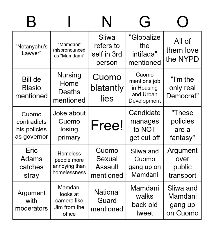 This bingo card has a free space and 35 words: Hasan Piker mentioned, Guardian Angels mentioned, Sliwa getting shot mentioned, Nursing Home Deaths mentioned, Cuomo Sexual Assault mentioned, "Globalize the intifada" mentioned, Bill de Blasio mentioned, Sliwa's beret mentioned, Cuomo blatantly lies, Question is secretly about Israel, Cuomo contradicts his policies as governor, All of them love the NYPD, 9/11 mentioned, Trump mentioned, "Netanyahu's Lawyer", Candidate manages to NOT get cut off, Mamdani walks back old tweet, Joke about Cuomo losing primary, Eric Adams catches stray, Sliwa and Mamdani gang up on Cuomo, Sliwa and Cuomo gang up on Mamdani, Argument with moderators, Argument over public transport, Mamdani looks at camera like Jim from the office, Sliwa refers to self in 3rd person, "I'm the only real Democrat", Mamdani's apartment is too cheap, "Slappin' fannies and killin' grannies", Cuomo mentions job in Housing and Urban Development, "These policies are a fantasy", Free buses, National Guard mentioned, Homeless people more annoying than homelessness, "Mamdani" mispronounced as "Mamdami" and Either Cuomo or Sliwa tries to get the other to drop out.