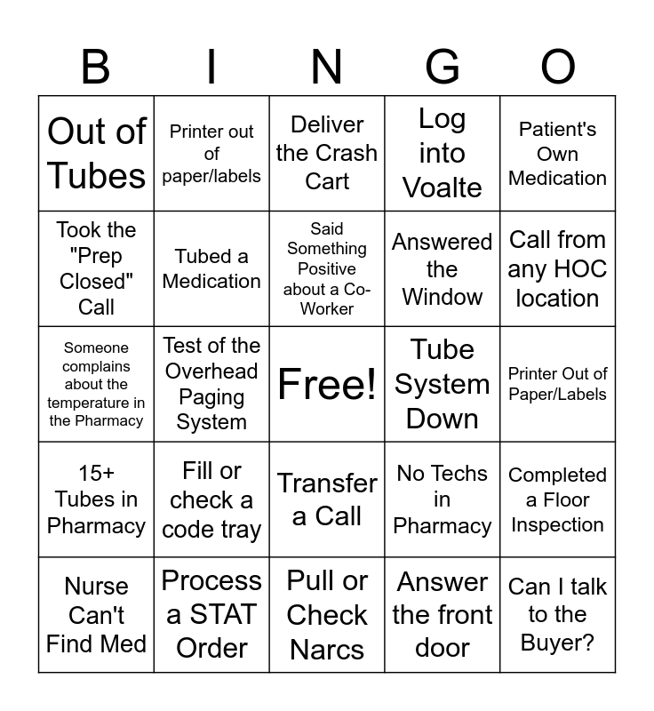 This bingo card has a free space and 44 words: Stock Out, Can I talk to the Buyer?, Med Rec Question Call, Nurse Can't Find Med, Call from the OR, Answer the front door, Deliver the Crash Cart, IV Compatibility Question, Patient's Own Medication, Process a STAT Order, Log into Voalte, Tube System Down, Transfer a Call, Fill or check a code tray, Robot Returns, Pull or Check Narcs, Set up a Courier, Someone complains about the temperature in the Pharmacy, Share a good catch or near miss, Call from any HOC location, Printer out of paper/labels, Swisslog Help Call, Deliver Pyxis, Out of Tubes, 4+ Meds to be Packaged, Printer Out of Paper/Labels, Nurse Can't Find Med in Fridge, Omnicell Discrepancy, No Techs in Pharmacy, 15+ Tubes in Pharmacy, Replaced a Crash Cart, Completed a Floor Inspection, STAT Heart, IV Keppra Made, Test of the Overhead Paging System, Floor Stock Request at the Window, Has Worked Here Less than a Year, Has Worked Here More than 25 Years, Said Something Positive about a Co-Worker, Took the "Prep Closed" Call, Answered the Window, Completed a Special Request from Pharmacist, Tubed a Medication and Delivered a Patient Med to the Floor.