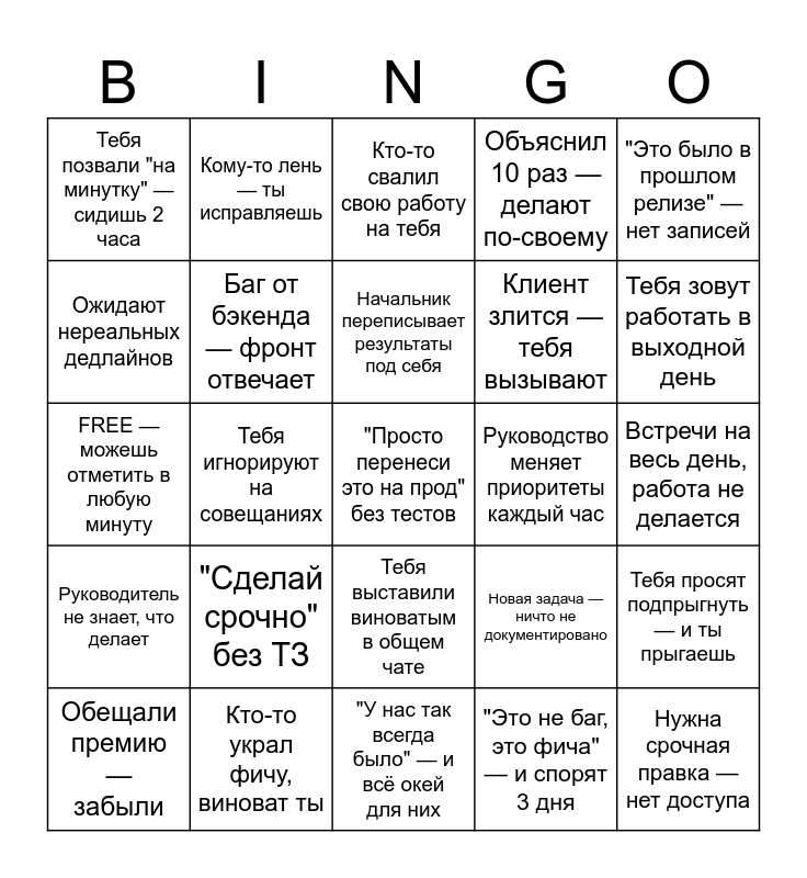 This bingo card has a free space and 24 words: "Сделай срочно" без ТЗ, Кто-то украл фичу, виноват ты, Начальник переписывает результаты под себя, Обещали премию — забыли, "Это было в прошлом релизе" — нет записей, Тебя позвали "на минутку" — сидишь 2 часа, Ожидают нереальных дедлайнов, Кому-то лень — ты исправляешь, Руководство меняет приоритеты каждый час, Тебя выставили виноватым в общем чате, Клиент злится — тебя вызывают, FREE — можешь отметить в любую минуту, Новая задача — ничто не документировано, Тебя просят подпрыгнуть — и ты прыгаешь, Баг от бэкенда — фронт отвечает, "Это не баг, это фича" — и спорят 3 дня, Встречи на весь день, работа не делается, Кто-то свалил свою работу на тебя, Тебя зовут работать в выходной день, Тебя игнорируют на совещаниях, Нужна срочная правка — нет доступа, Руководитель не знает, что делает, Объяснил 10 раз — делают по-своему and "У нас так всегда было" — и всё окей для них.