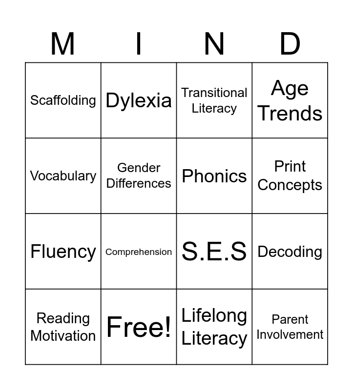 This bingo card has 16 words: Free!, Decoding, Transitional Literacy, Scaffolding, Fluency, Dylexia, S.E.S, Lifelong Literacy, Vocabulary, Gender Differences, Reading Motivation, Age Trends, Comprehension, Print Concepts, Phonics and Parent Involvement.
