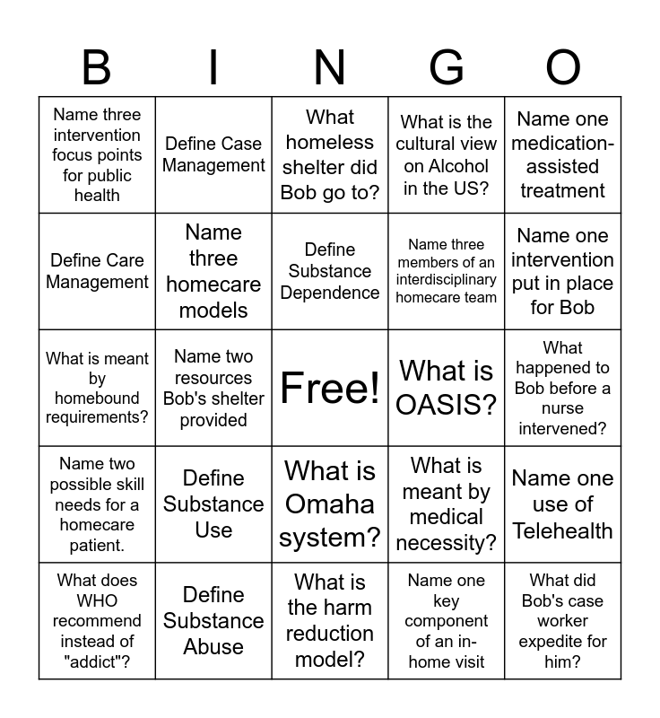 This bingo card has a free space and 24 words: Define Substance Use, Define Substance Abuse, Define Substance Dependence, What does WHO recommend instead of "addict"?, Name one medication-assisted treatment, Name three intervention focus points for public health, Define Care Management, Define Case Management, What is OASIS?, What is Omaha system?, Name three members of an interdisciplinary homecare team, What is meant by homebound requirements?, What is meant by medical necessity?, Name one use of Telehealth, Name three homecare models, Name one key component of an in-home visit, What happened to Bob before a nurse intervened?, What homeless shelter did Bob go to?, Name one intervention put in place for Bob, Name two resources Bob's shelter provided, What did Bob's case worker expedite for him?, Name two possible skill needs for a homecare patient., What is the cultural view on Alcohol in the US? and What is the harm reduction model?.