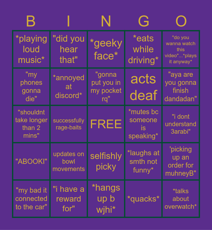 This bingo card has a free space and 24 words: updates on bowl movements, "i have a reward for", "gonna put you in my pocket rq", "my bad it connected to the car", "do you wanna watch this video"...*plays it anyway*, *playing loud music*, "my phones gonna die", "did you hear that", *mutes bc someone is speaking*, selfishly picky, acts deaf, "shouldnt take longer than 2 mins", *laughs at smth not funny*, 'picking up an order for muhneyB", *annoyed at discord*, *quacks*, "i dont understand 3arabi", *geeky face*, "aya are you gonna finish dandadan", successfully rage-baits, *talks about overwatch*, "ABOOKI", *eats while driving* and *hangs up b wjhi*.