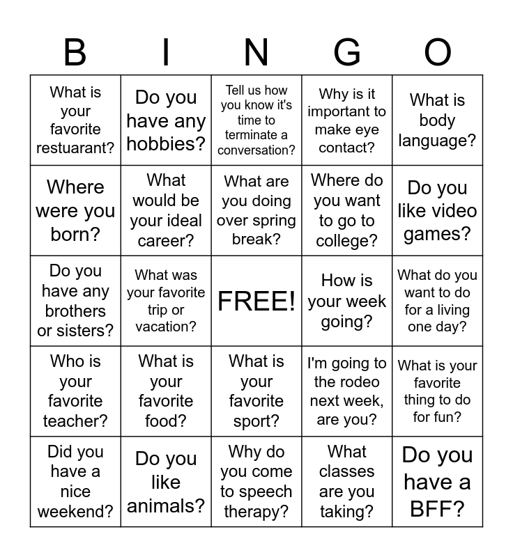 This bingo card has a free space and 24 words: What is your favorite food?, Do you like animals?, What are you doing over spring break?, Did you have a nice weekend?, What is body language?, What is your favorite restuarant?, Where were you born?, Do you have any hobbies?, How is your week going?, What is your favorite sport?, Where do you want to go to college?, Do you have any brothers or sisters?, I'm going to the rodeo next week, are you?, What is your favorite thing to do for fun?, What would be your ideal career?, What classes are you taking?, What do you want to do for a living one day?, Tell us how you know it's time to terminate a conversation?, Do you like video games?, What was your favorite trip or vacation?, Do you have a BFF?, Who is your favorite teacher?, Why is it important to make eye contact? and Why do you come to speech therapy?.