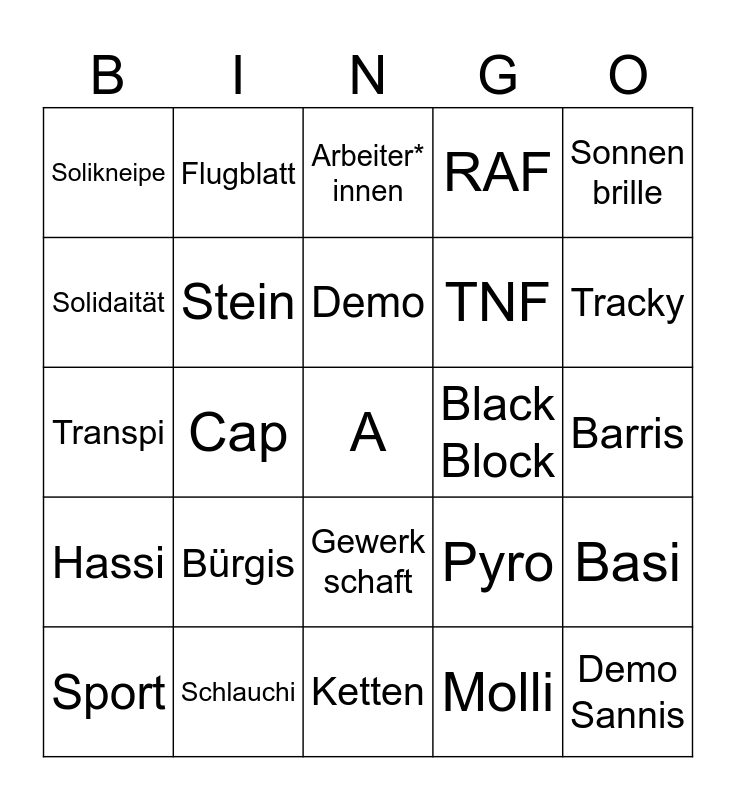 This bingo card has a free space and 29 words: Sport, Plenum, Cap, Dose, Solikneipe, Arbeiter* innen, Stein, Bürgis, Black Block, Schlauchi, Barris, Demo Sannis, Ketten, Molli, Tracky, Wind breaker, Gewerk schaft, Hassi, Sonnen brille, Transpi, Pyro, Besetzung, TNF, Solidaität, RAF, Flugblatt, Basi, Demo and Theorie.