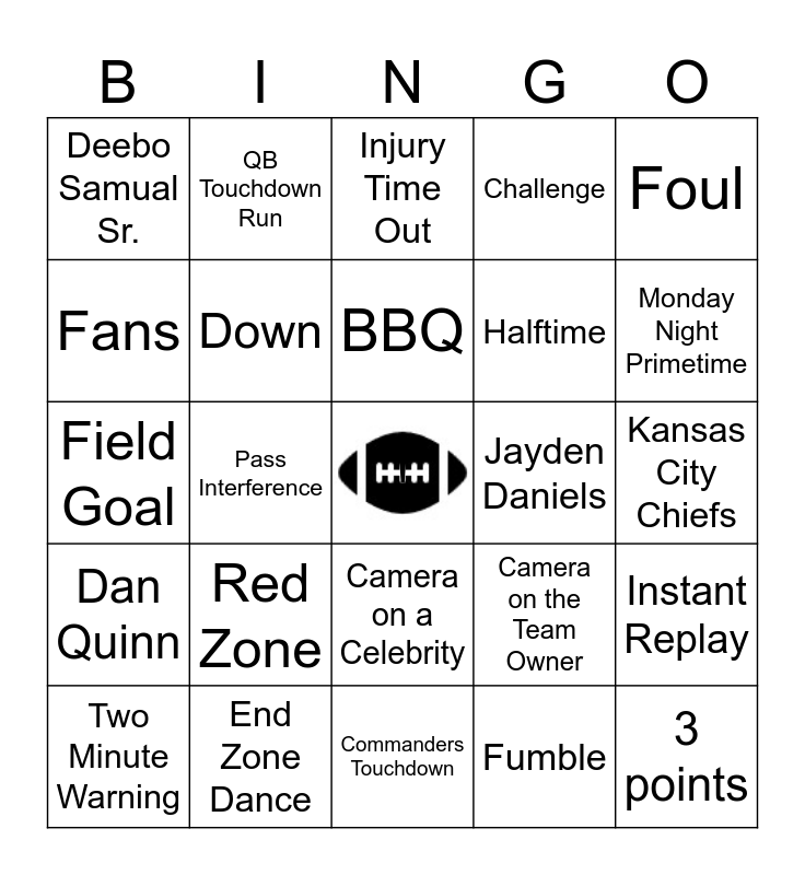 This bingo card has a free space and 54 words: Arrowhead, Dan Quinn, 4th Down, Turnover, Camera on a Celebrity, Super Bowl, Challenge, Overturn, Fans, Tie, Deebo Samual Sr., Reversed Call, End Zone Dance, Two Minute Warning, Xavier Worthy, Commanders Touchdown, 3 points, Halftime, Call Overturned Upon Review, Kansas City Chiefs, Camera on the Team Owner, Punt, Jayden Daniels, Foul, Flag, QB Touchdown Run, End of Quarter, Andy Ried, Interception, Fumble, Chiefs Touchdown, Travis Kelce, Missed Field Goal, Sack, Injury Time Out, Offsides, Field Goal, Instant Replay, Timeout, Down, Taylor Swift, Washington Commanders, 1st & Goal, Beer Commercial, Red Zone, Pick 6, Special Teams, Face Mask, BBQ, Pass Interference, Monday Night Primetime, Roughing the Passer, Dallas Cowboys and Raiders.