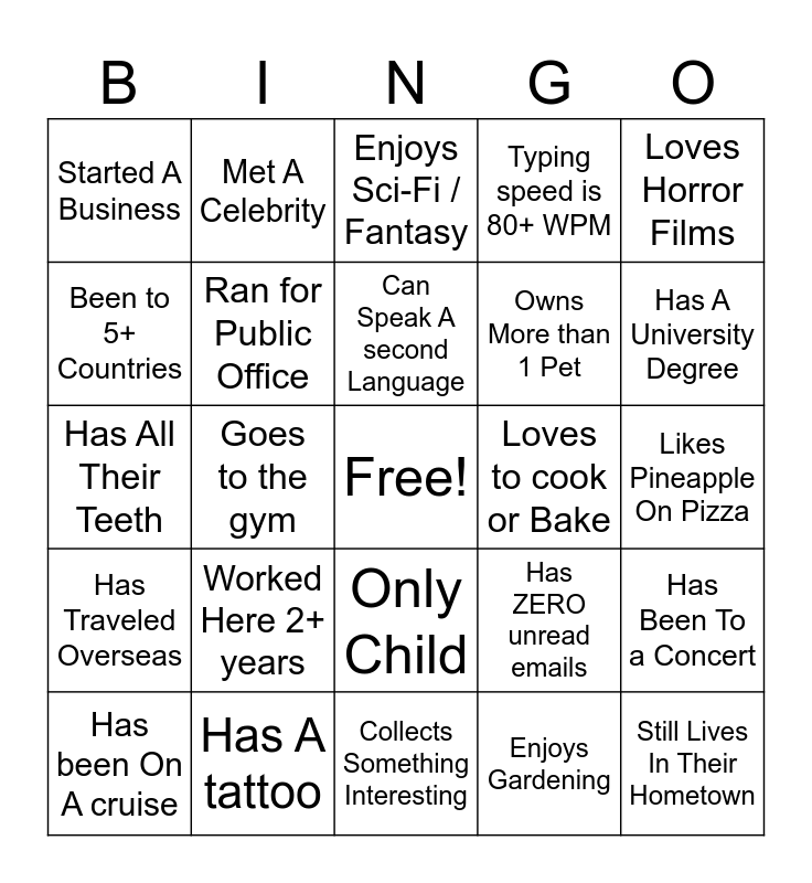 This bingo card has a free space and 24 words: Worked Here 2+ years, Has A tattoo, Can Speak A second Language, Has been On A cruise, Loves Horror Films, Started A Business, Been to 5+ Countries, Met A Celebrity, Loves to cook or Bake, Only Child, Owns More than 1 Pet, Has All Their Teeth, Has ZERO unread emails, Has Been To a Concert, Ran for Public Office, Enjoys Gardening, Likes Pineapple On Pizza, Enjoys Sci-Fi / Fantasy, Has A University Degree, Goes to the gym, Still Lives In Their Hometown, Has Traveled Overseas, Typing speed is 80+ WPM and Collects Something Interesting.