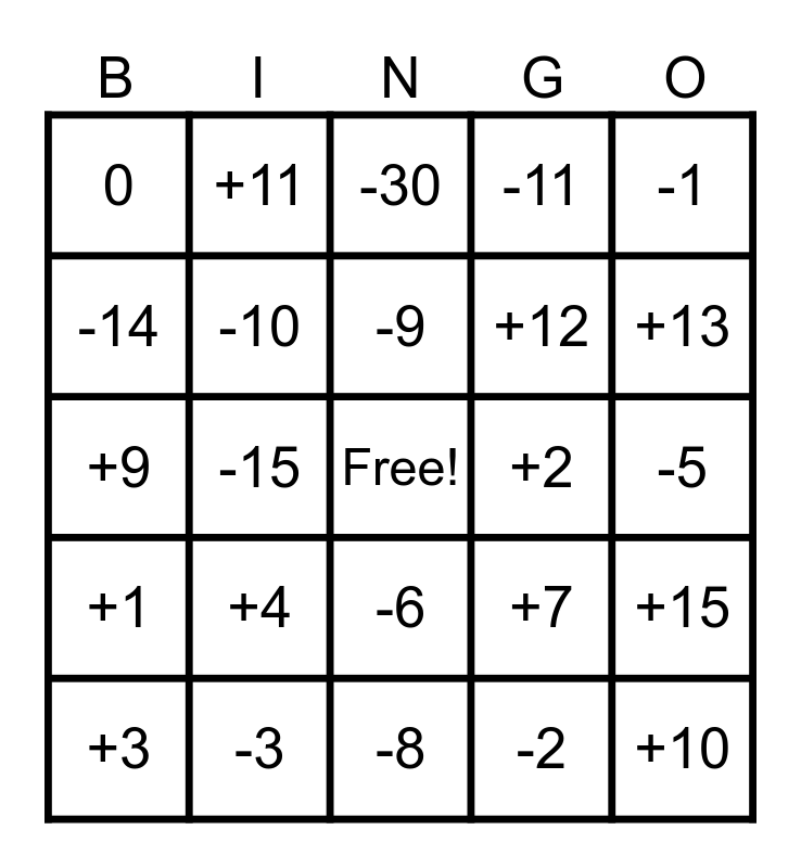 This bingo card has a free space and 34 words: +33, -2, +8, -4, +1, -10, -1, +3, +11, +6, -9, -30, -20, -7, +2, +13, -3, +9, +4, +7, -6, +5, 0, -5, -8, +10, -11, -12, +12, -14, +14, -15, +15 and -16.