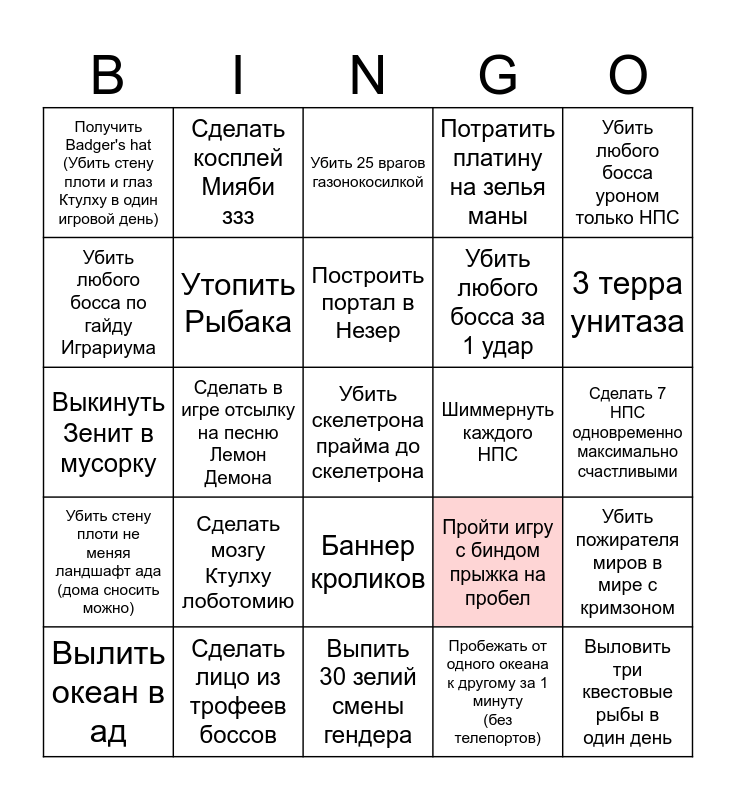 This bingo card has 25 words: Сделать мозгу Ктулху лоботомию, Выпить 30 зелий смены гендера, Построить портал в Незер, Вылить океан в ад, Убить любого босса уроном только НПС, Получить Badger's hat (Убить стену плоти и глаз Ктулху в один игровой день), Убить любого босса по гайду Играриума, Сделать косплей Мияби ззз, Шиммернуть каждого НПС, Баннер кроликов, Убить любого босса за 1 удар, Выкинуть Зенит в мусорку, Пройти игру с биндом прыжка на пробел, Убить пожирателя миров в мире с кримзоном, Утопить Рыбака, Выловить три квестовые рыбы в один день, Сделать 7 НПС одновременно максимально счастливыми, Убить 25 врагов газонокосилкой, 3 терра унитаза, Сделать в игре отсылку на песню Лемон Демона, Убить скелетрона прайма до скелетрона, Сделать лицо из трофеев боссов, Убить стену плоти не меняя ландшафт ада (дома сносить можно), Потратить платину на зелья маны and Пробежать от одного океана к другому за 1 минуту (без телепортов).
