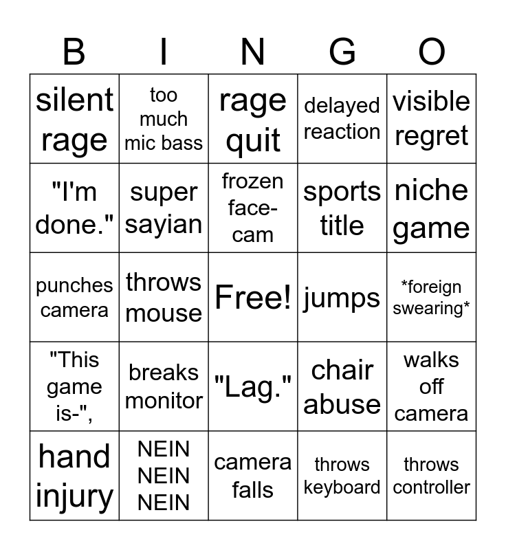 This bingo card has a free space and 48 words: breaks keyboard, throws controller, full-auto slam, camera falls, breaks monitor, headset falls off, too much mic bass, *Windows SFX*, "I'm done.", breaks mic, super sayian, delayed reaction, walks off camera, chair abuse, mic abuse, "**k this game”, frozen face-cam, jumps, insane rambling, visible regret, throws mouse, throws keyboard, silent rage, sports title, souls-like, niche game, hand injury, dirty dishes, "Lag.", "This game is-",, lol, mic peaks, acrobatic, two-handed power attack, NEIN NEIN NEIN, …fortnite, breaks mouse, *foreign swearing*, WTF, blames game, keycaps flying, home renovation, rage quit, falls, punches camera, seizes, getting over it-like and HACKERS.