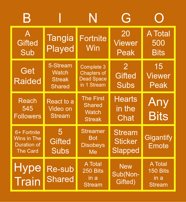 This bingo card has 25 words: 5 Gifted Subs, A Total 250 Bits in a Stream, Complete 3 Chapters of Dead Space in 1 Stream, Hype Train, A Total 500 Bits, A Gifted Sub, Get Raided, Tangia Played, Hearts in the Chat, Streamer Bot Disobeys Me, 2 Gifted Subs, Reach 545 Followers, Stream Sticker Slapped, Gigantify Emote, 5-Stream Watch Streak Shared, A Total 150 Bits in a Stream, Any Bits, Fortnite Win, 15 Viewer Peak, React to a Video on Stream, The First Shared Watch Streak, Re-sub Shared, 6+ Fortnite Wins in The Duration of The Card, 20 Viewer Peak and New Sub(Non-Gifted).