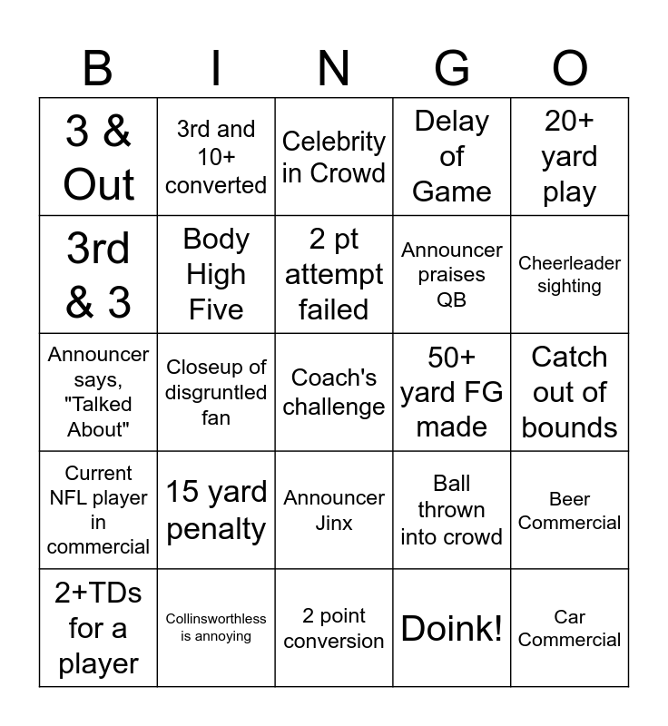This bingo card has 25 words: 15 yard penalty, 2 point conversion, 2 pt attempt failed, 2+TDs for a player, 20+ yard play, 3 & Out, 3rd & 3, 3rd and 10+ converted, 50+ yard FG made, Announcer Jinx, Announcer praises QB, Announcer says, "Talked About", Ball thrown into crowd, Beer Commercial, Body High Five, Car Commercial, Catch out of bounds, Celebrity in Crowd, Cheerleader sighting, Closeup of disgruntled fan, Coach's challenge, Collinsworthless is annoying, Current NFL player in commercial, Delay of Game and Doink!.