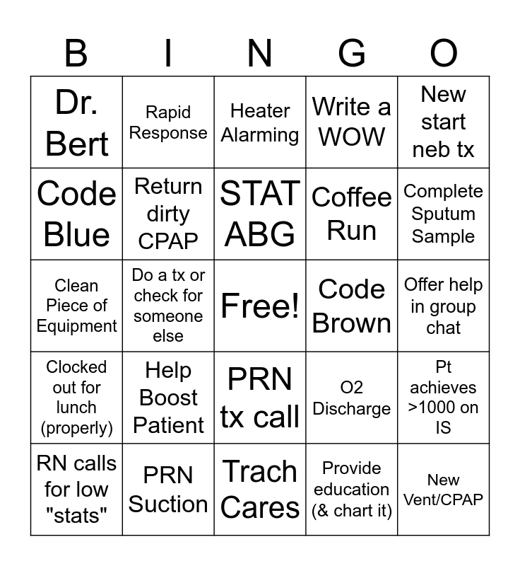 This bingo card has a free space and 24 words: Help Boost Patient, PRN Suction, STAT ABG, RN calls for low "stats", New start neb tx, Dr. Bert, Code Blue, Rapid Response, Code Brown, PRN tx call, Coffee Run, Clean Piece of Equipment, O2 Discharge, Pt achieves >1000 on IS, Return dirty CPAP, Provide education (& chart it), Offer help in group chat, Heater Alarming, Complete Sputum Sample, Do a tx or check for someone else, New Vent/CPAP, Clocked out for lunch (properly), Write a WOW and Trach Cares.