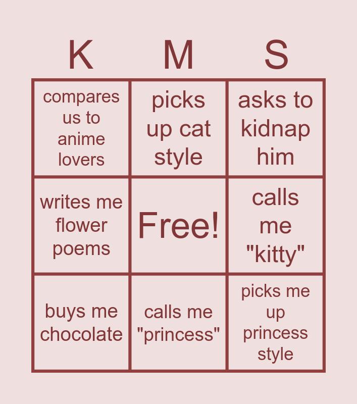 This bingo card has a free space and 8 words: calls me "kitty", asks to kidnap him, picks up cat style, buys me chocolate, compares us to anime lovers, picks me up princess style, writes me flower poems and calls me "princess".