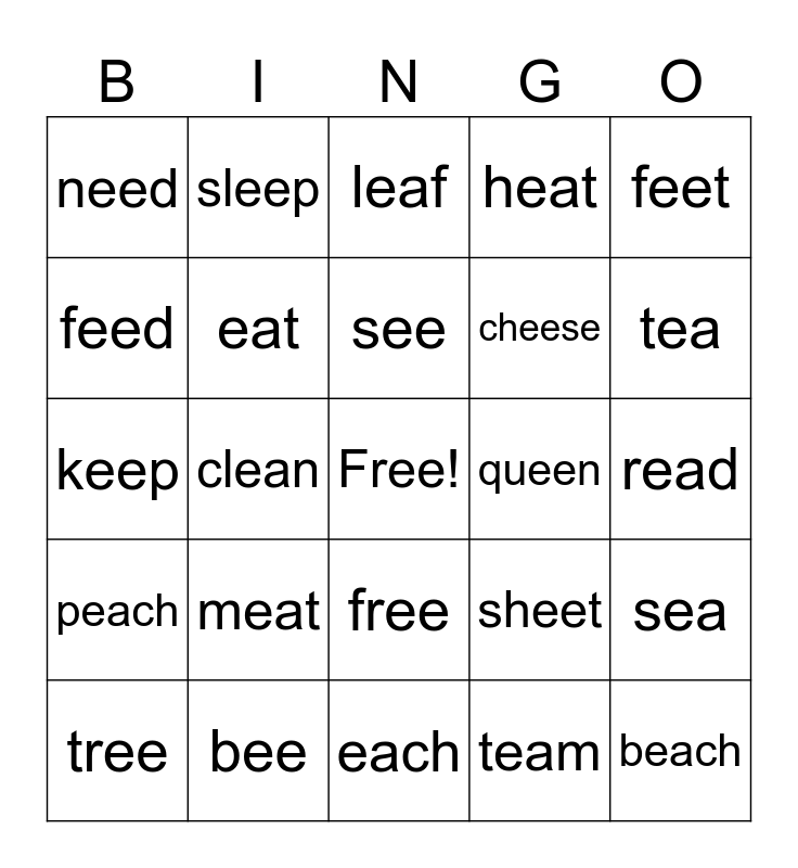 This bingo card has a free space and 24 words: meat, bee, see, tree, feet, need, feed, sleep, queen, free, cheese, keep, sheet, sea, eat, team, read, leaf, tea, clean, beach, peach, heat and each.