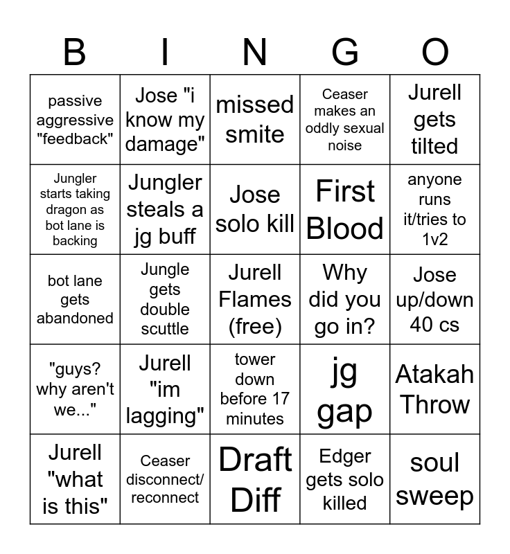 This bingo card has a free space and 24 words: Jurell "im lagging", Ceaser disconnect/ reconnect, Jose solo kill, Jurell "what is this", Jurell gets tilted, passive aggressive "feedback", Jungler starts taking dragon as bot lane is backing, Jose "i know my damage", Why did you go in?, tower down before 17 minutes, First Blood, bot lane gets abandoned, jg gap, Atakah Throw, Jungler steals a jg buff, Edger gets solo killed, Jose up/down 40 cs, missed smite, anyone runs it/tries to 1v2, Jungle gets double scuttle, soul sweep, "guys? why aren't we...", Ceaser makes an oddly sexual noise and Draft Diff.