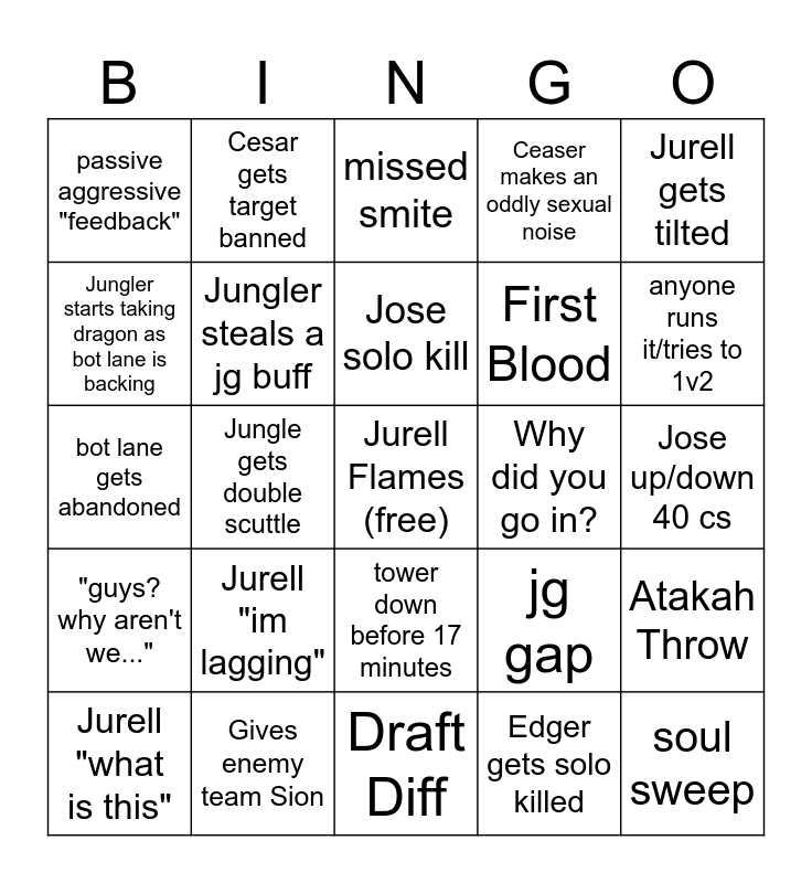 This bingo card has a free space and 24 words: Jurell "im lagging", Gives enemy team Sion, Jose solo kill, Jurell "what is this", Jurell gets tilted, passive aggressive "feedback", Jungler starts taking dragon as bot lane is backing, Cesar gets target banned, Why did you go in?, tower down before 17 minutes, First Blood, bot lane gets abandoned, jg gap, Atakah Throw, Jungler steals a jg buff, Edger gets solo killed, Jose up/down 40 cs, missed smite, anyone runs it/tries to 1v2, Jungle gets double scuttle, soul sweep, "guys? why aren't we...", Ceaser makes an oddly sexual noise and Draft Diff.
